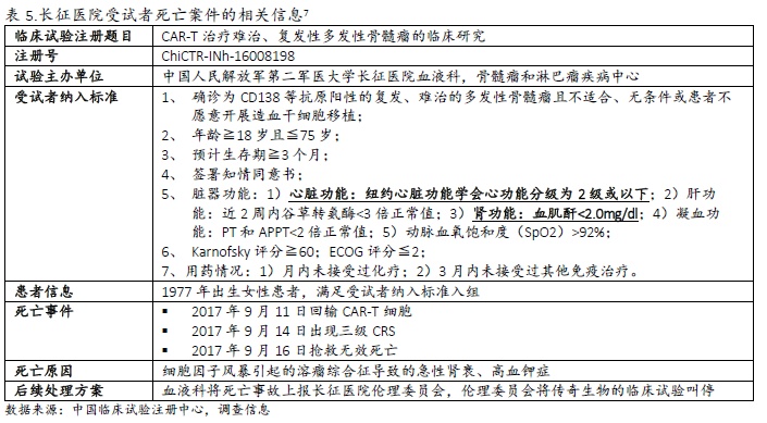 根据我们收集到的一手调查资料,我们发现死亡受试者为1977年出生女性,心脏功能及肾功能均正常否则根据长征医院受试者纳入标准(表5)将无法入组临床试验。2017年9月11日接受细胞回输,9月14日出现3级细胞因子风暴,9月16日由于引发溶瘤综合征导致的急性肾衰、高血钾症,抢救无效死亡。收到死亡报告之后,长征医院伦理委员会叫停了这项临床试验。