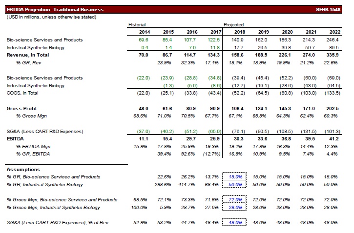 我们预测原有的生命科学服务与产品业务按照15%增速增长,而工业酶业务按照50%的增速增长。2018年该部分业务的EBTIDA约3,030万美元,按照25.4x EV/EBTIDA对应估值在7.56亿美元,对应每股价值在3.29港币。