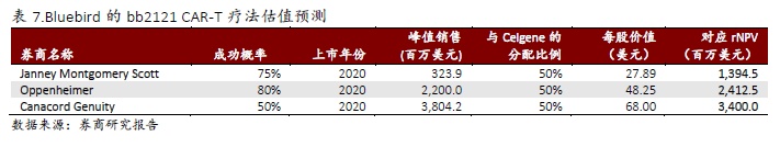 对比Bluebird的CAR-T估值,我们认为公司目前的临床试验阶段对应4.73亿美元估值合理。Bluebird Bio目前已经完成的43例临床试验(传奇生物目前尚未完成任何一例满足监管审核标准的临床试验),华尔街对Bluebird的bb2121 CAR-T疗法的估值在14-34亿美元之间。值得注意的是,Bluebird已经将其最新的临床实验数据公布在2018年ASCO会议上,预计1-2年之内有望获得FDA批准开展商业化销售;而传奇生物在商业推广上已经明显落后于竞争对手。