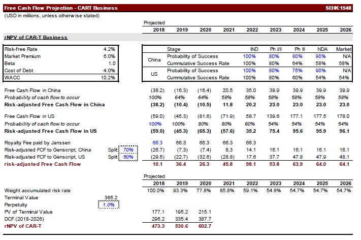 首先我们认为公司的CAR-T技术存在巨大的技术缺陷,但是我们假设技术不存在技术缺陷并尝试测算CAR-T技术的实际商业价值。我们使用风险调整后的净现值risk-adjusted NPV方法预测CAR-T业务的价值。我们 使用10.2%的WACC 进行折现,预计2026年达到稳态自由现金流。在中国每疗程定价20万元、美国每疗程定价35万美元,中国峰值销售预测2.5亿美元,美国峰值销售5.0亿美元。假设中国、美国的累计成功概率分别为58%和54%,那么我们得出公司CAR-T部分业务2018年底估值约4.73亿美元,对应每股价值2.03港币。