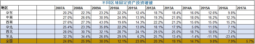 中国从地理位置上划分,可以分为华东、中南、西南、华北、西北、东北六大区域。其中华东、华西、西南经济基础好,过去十年固定资产投资增速普遍达到双位数。华北、西北、东北经济情况相对薄弱,固定资产投资增速低于全国平均。
