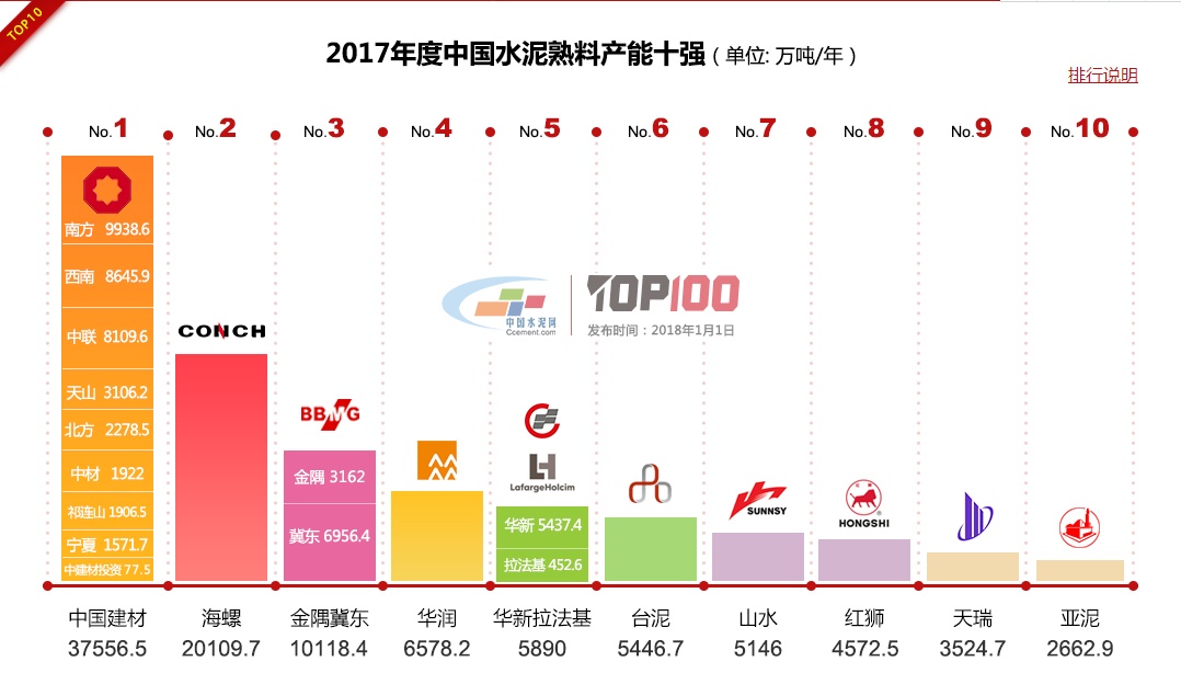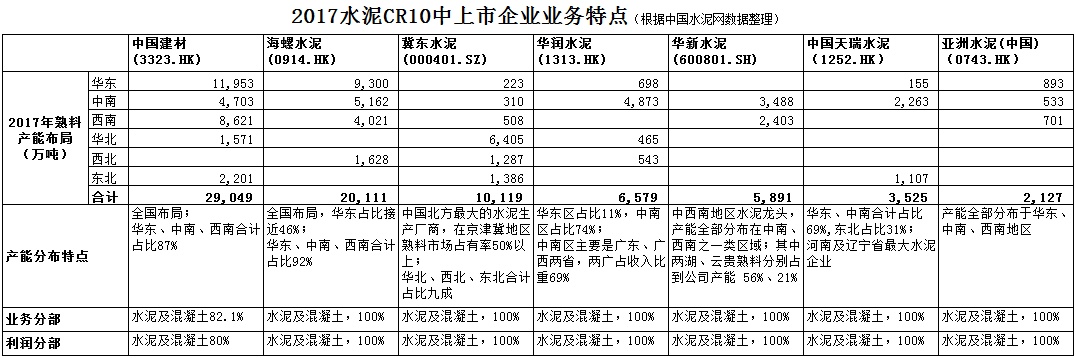 根据中国水泥网公布的2017熟料产能十强名单,其中:金隅冀东水泥业务的组成方式为,金隅股份与冀东水泥成立合资公司,各自注入水泥业务,冀东水泥占股52.91%,合资公司业务并表;台泥国际退市;山水水泥因股权争端自2015年4月开始一直停牌;红狮水泥未上市。