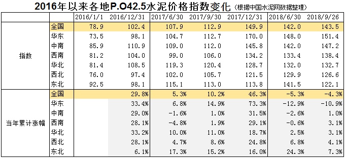 华北、西北地区水泥价格维持稳定上涨,但涨幅仍逊于华东、中南、西南三区。2018年前三季度水泥价格整体保持平稳。