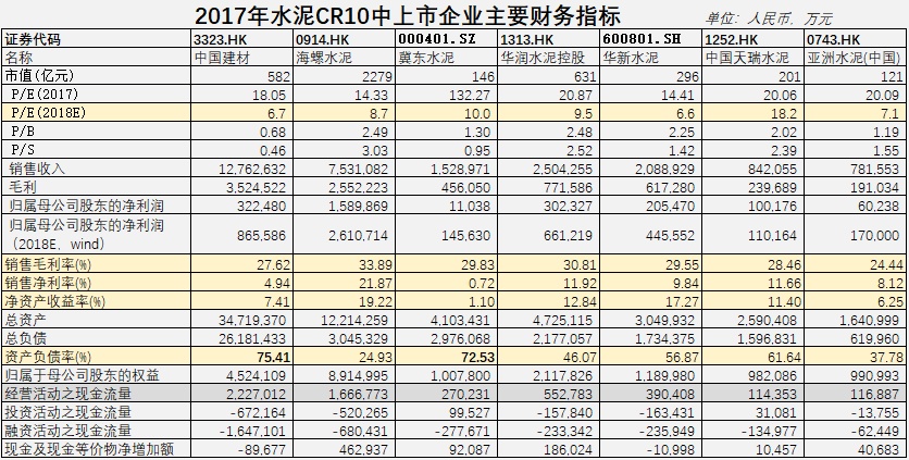 中国水泥CR10中实际上能够分析的水泥企业只有七家,以下主要针对这七家已上市公司进行对比分析。