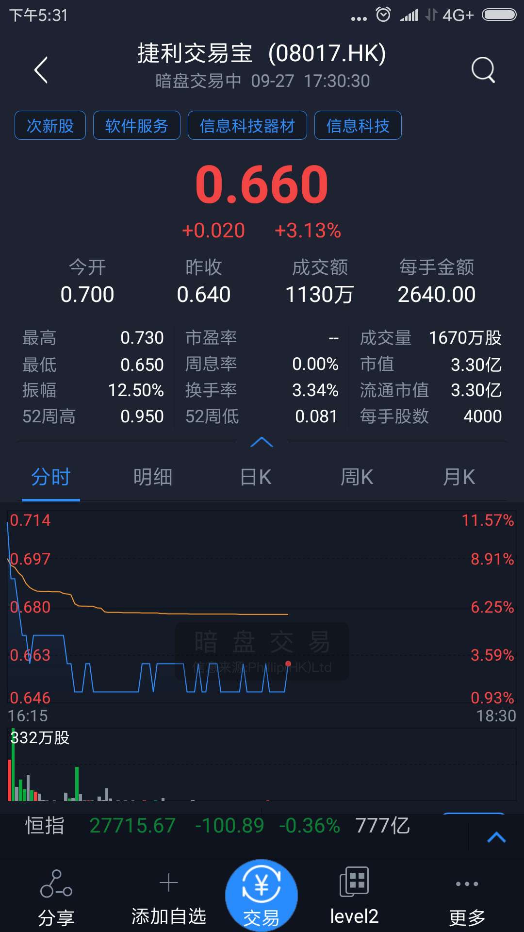 捷利交易宝今日下午4点15分暗盘以0.7港元开盘,高招股定价9.38%,短暂冲高后迅速回落。从盘面来看有少量国际配售投资者选择获利了结;从单笔卖出数量来看,未见乙组投资者清仓;从挂单席位来看明显有资金在接盘。大资金没有选择主动出击,很有可能是诱骗散户手中筹码。