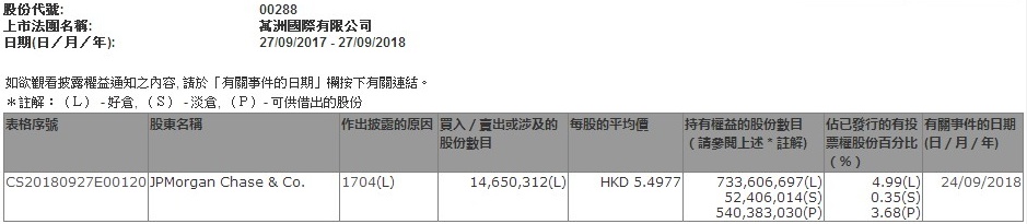智通财经APP获悉,根据联交所资料显示,摩根大通于9月24日减持万洲国际(00288)1465万股,每股作价5.50港元,总值约8057.5万港元,最新持股量约为7.33亿股。