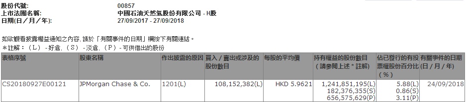 智通财经APP获悉,根据联交所资料显示,摩根大通于9月24日减持中石油(00857)1.08亿股,每股作价5.96港元,总值约6.44亿港元,最新持股量约为12.41亿股。