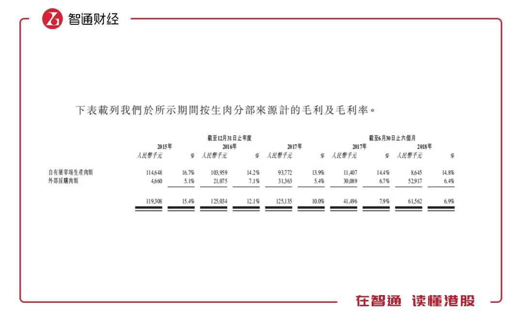 由于,外购肉呈现快速增长趋势,公司生肉分部的毛利率截至2015年、2016年、2017年年度及截至2018年上半年,分别约为15.4%、12.1%、10.0%及6.9%不断走低。