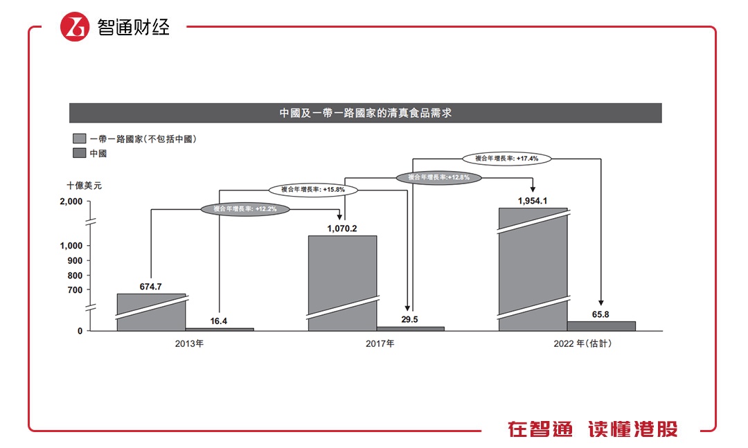 预计于2017至2022年,中国及其他一带一路国家对清真食品的需求分别以17.4%及12.8%的复合年增长率快速度增长。根据弗若斯特沙利文的资料,2013年至2017年中国生牦牛肉消费量以约9.3%的复合年增长率增长,并预期2018年至2022年将以约5%的复合年增长率增长。