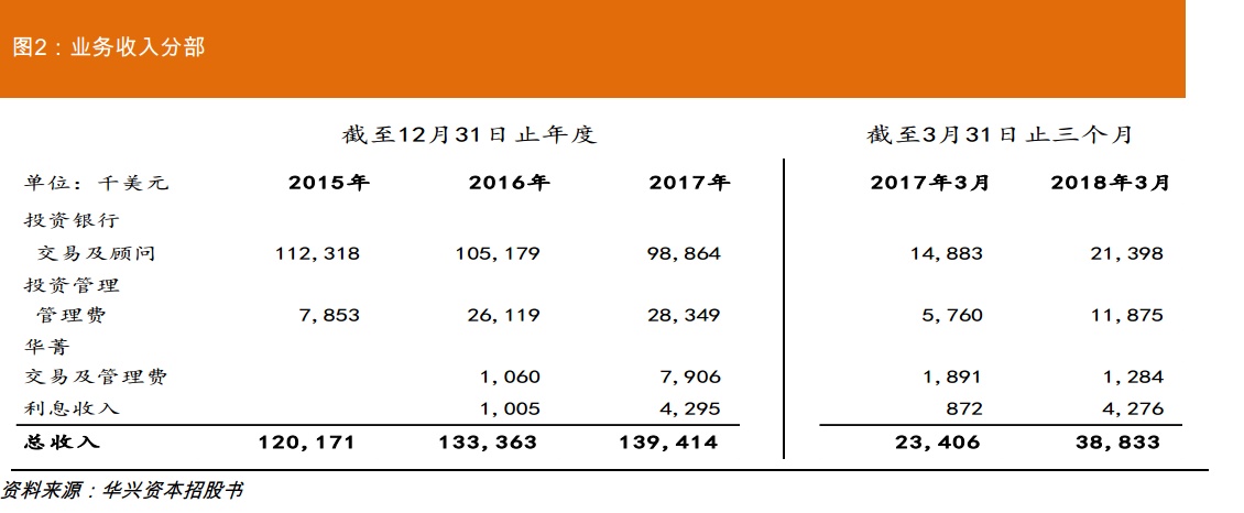 华兴认为,这部分增长主要得益于两方面:一是公司2017年交易储备强劲,私募融资顾问费与并购顾问费收入双增,整体增长136.4%;二是公司股票销售交易佣金收入增加132.9%。更为亮眼的是,投资银行分部的经营利润同比增长214.2%。