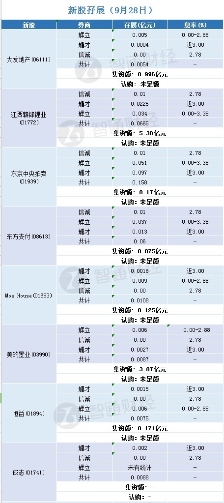 智通财经APP获悉,大发地产(06111)、江西赣锋锂业(01772)、东京中央拍卖(01939)、东方支付(08613)、Mos House(01653)、美的置业(03990)、恒益(01894)、成志(01741)等正在招股中。截至9月28日,辉立、耀才、信诚三家券商,为大发地产(06111)借出0.0054亿孖展金,未足额;为江西赣锋锂业(01772)借出0.0665亿孖展金,未足额;为东京中央拍卖(01939)借出0.158亿孖展金,未足额;为东方支付(08613)借出0.06亿孖展金,未足额;为Mos House(01653)借出0.0108亿孖展金,未足额;为美的置业(03990)借出0.0087亿孖展金,未足额;为恒益(01894)借出0.0075亿孖展金,未足额。