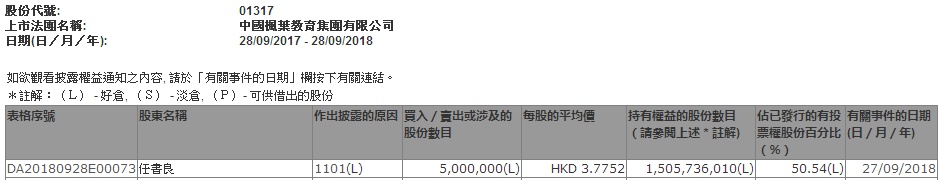 智通财经APP获悉,根据联交所资料显示,任书良于9月27日增持枫叶教育(01317)500万股,每股作价3.38港元,总值约1690万港元,最新持股量约为15.05亿股。