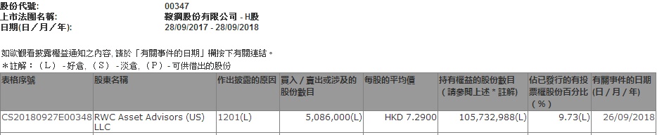 智通财经APP获悉,根据联交所资料显示,RCW Asset Advisors(US)LLC于9月26日减持鞍钢股份(00347)508万股,每股作价7.29港元,总值约3703.32万港元,最新持股量约为1.05亿股。