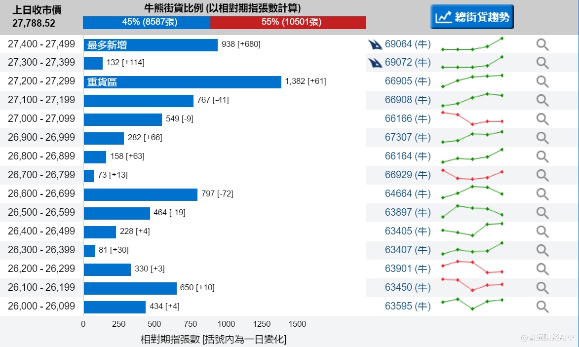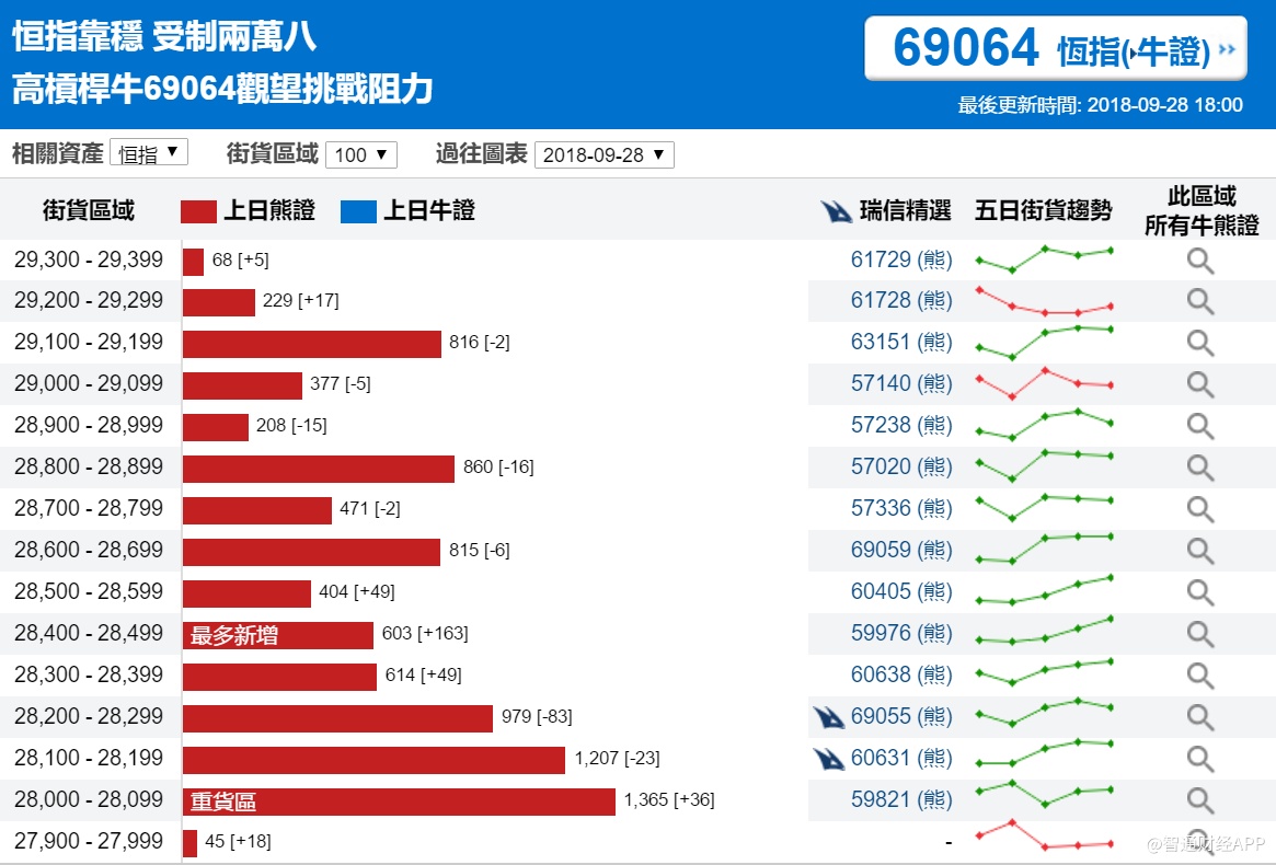 智通财经APP获悉,截至9月27日,恒指最新的牛熊街货比例为45:55。从瑞信恒指牛熊证街货分布图中得到的数据显示,熊证街货重货区在28000-28099区间,该区间熊证数量为1365张,比上一交易日增加36张;最多新增在28400-28499区间,新增163张。牛证中重货区在27200-27299区间,该区间最新牛证数量为1382张,比上一交易日增加61张,最多新增在27400-27499这一区间,新增680张。