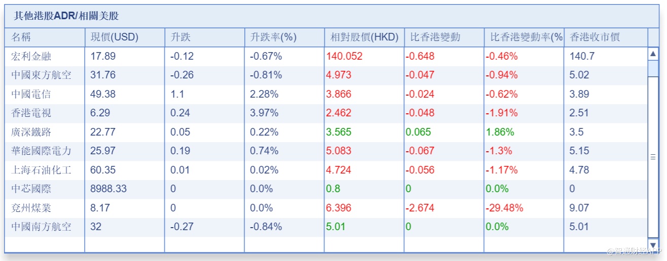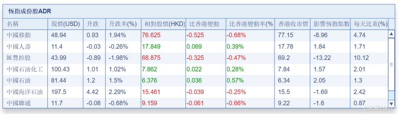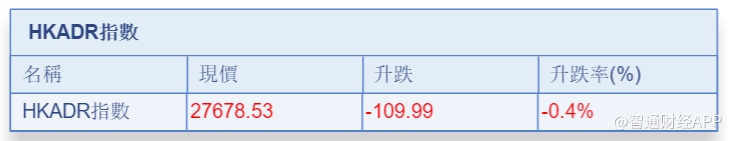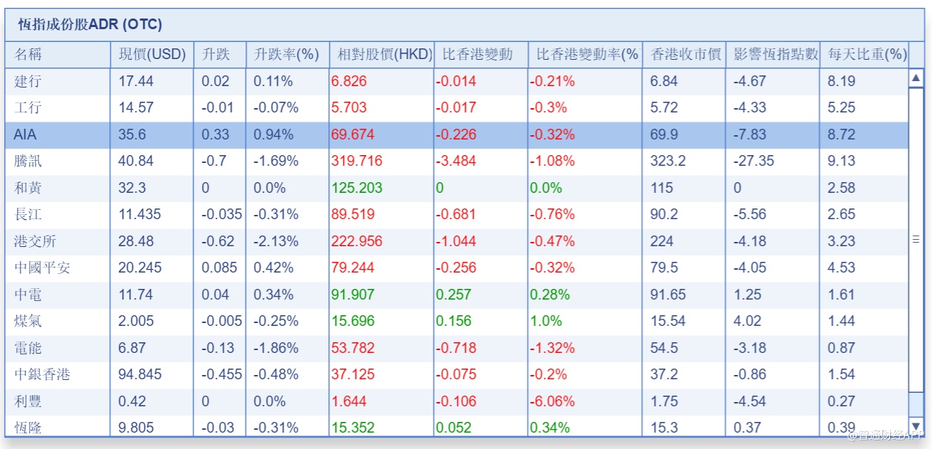 港股ADR指数全日偏软,按比例计算,收报27678.53点,跌109.99点。大型蓝筹升跌不一,汇控报68.875元,较港收市跌0.325元;腾讯收报319.716元,较港收市跌3.484元。具体数据如下: