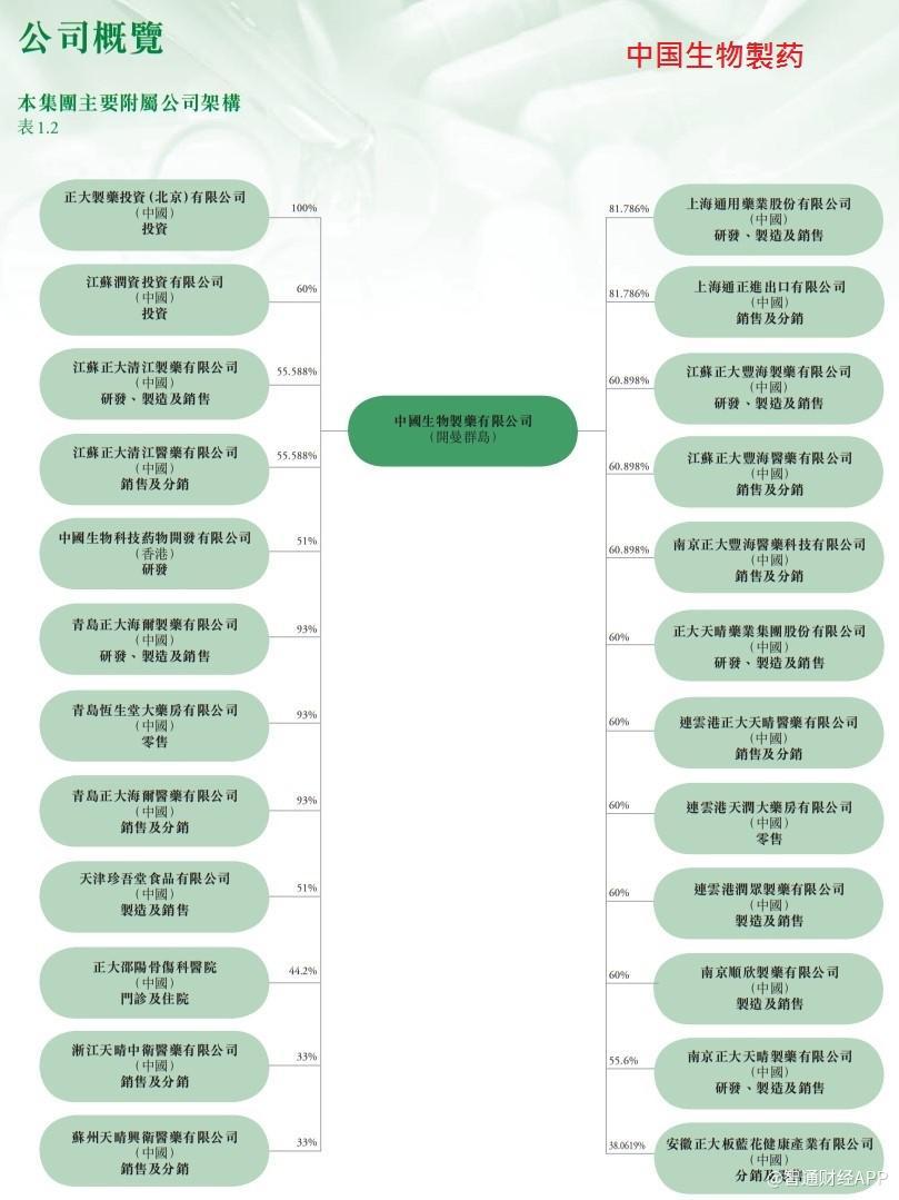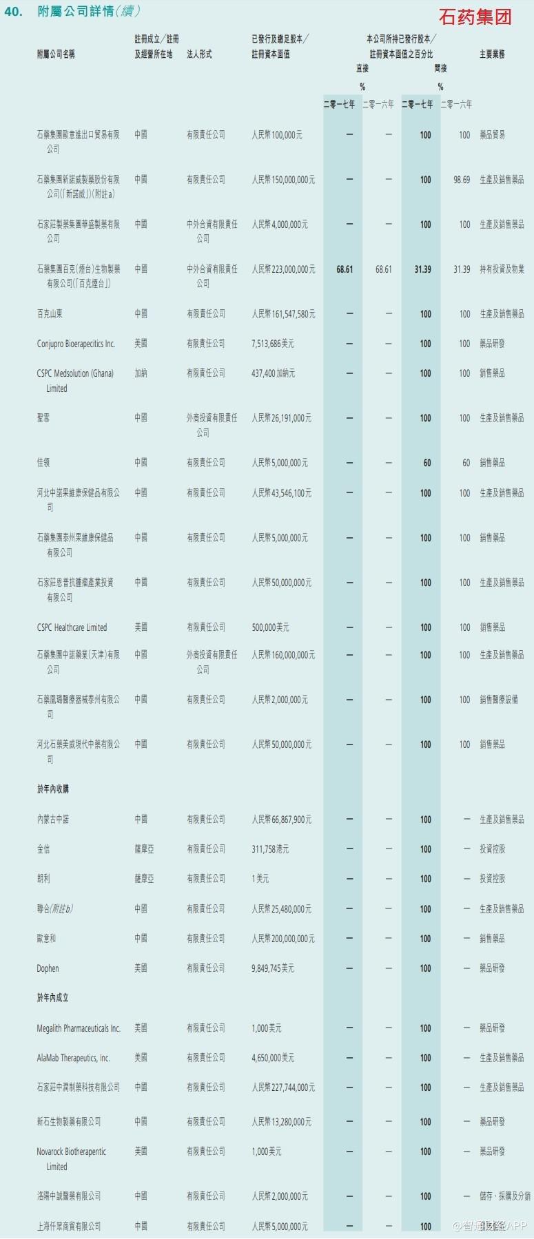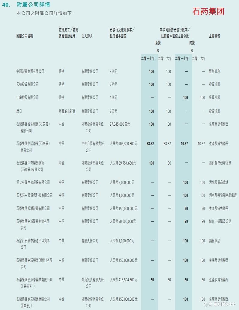 再看股权结构,两间公司皆拥有多个子公司或联营公司以生产各类药物,但它们控制附属公司的策略却不尽相同。以下是2017年年报所述石药集团旗下的公司分布。可以看到,无论是直接还是间接持,绝大多数附属公司均为石药全资拥有。所以石药的综合财务报表十分容易分析,总之所有收入和费用均百分百反映石药集团的营运状况就是了。