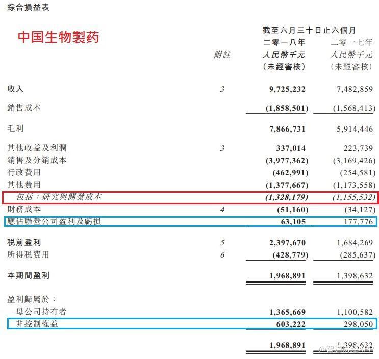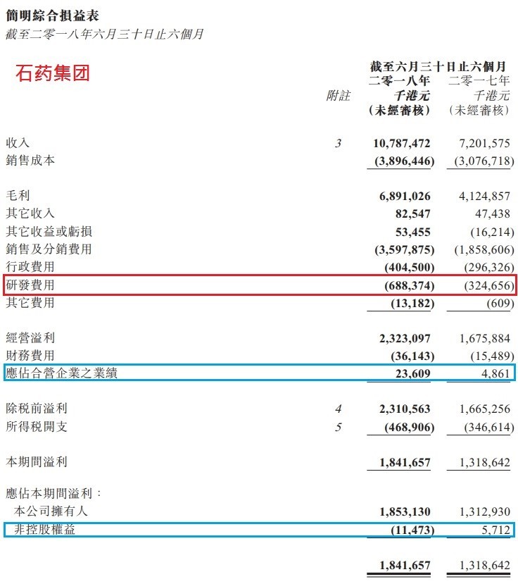 再看石药,如前文所述,石药的附属公司几乎都是全资拥有,所以损益表的收入和开支便完全反映集团实际状况。利润方面,无论应佔联营公司盈利的0.24亿港元,还是非控制权益亏损的0.11亿港元,相对18.5亿港元盈利均是微不足道,所以石药的损益表是较为简单易明的。