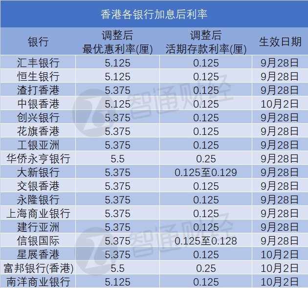 一张图带你看香港各银行调整利率,普遍上调12.5个基点