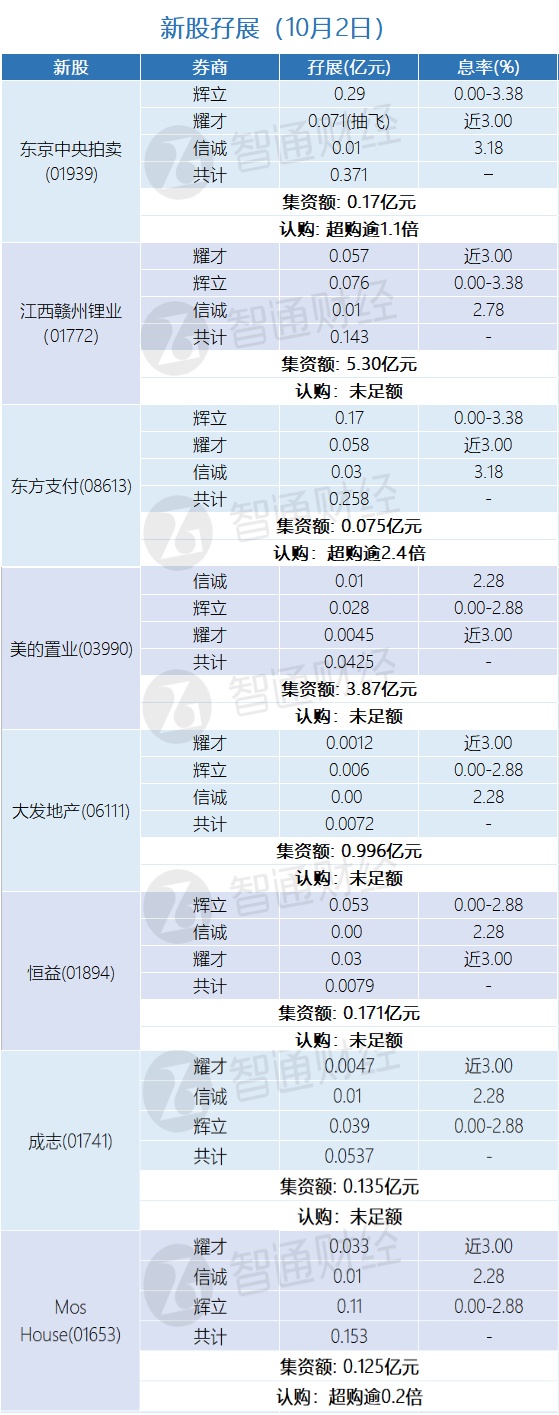 智通财经APP获悉,大发地产(06111)、江西赣锋锂业(01772)、东京中央拍卖(01939)、东方支付(08613)、Mos House(01653)、美的置业(03990)、恒益(01894)、成志(01741)等正在招股中。截至10月2日,辉立、耀才、信诚三家券商,为大发地产(06111)借出0.996亿孖展金,未足额;为江西赣锋锂业(01772)借出0.143亿孖展金,未足额;为东京中央拍卖(01939)借出0.17亿孖展金,超购逾1.1倍;为东方支付(08613)借出0.258亿孖展金,超购逾2.4倍;为Mos House(01653)借出0.153亿孖展金,超购逾0.2;为美的置业(03990)借出0.0425亿孖展金,未足额;为恒益(01894)借出0.0079亿孖展金,未足额。