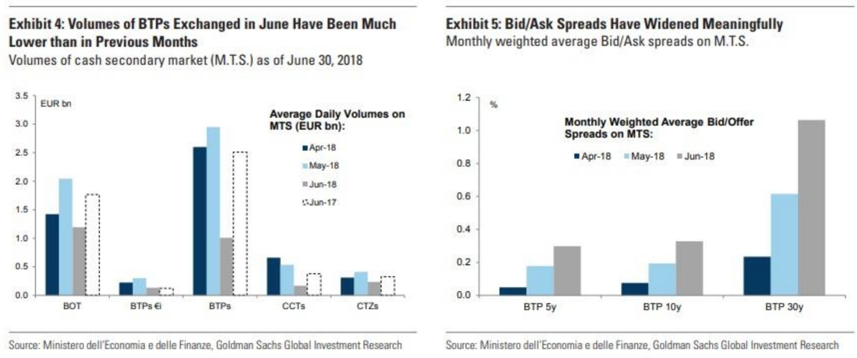 第三,最近几个月市场波动加剧可能对BTP流动性和市场深度产生持久影响。在图4中,高盛展示了2018年4、5、6月意大利政府证券在现金二级市场(MTS)的平均日交易量。6月开始的意大利债券抛售,6月交换的BTP数量,几乎是四月和五月观察到的三分之一。虽然这些数据是几个月前的,但是数量的减少,以及买卖价差的显著增加表明,市场流动性可能严重恶化,高盛认为这导致价格越来越高。