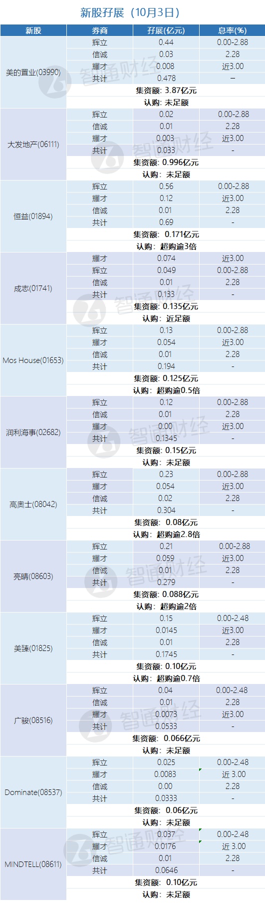 智通财经APP获悉,大发地产(06111)、Mos House(01653)、美的置业(03990)、恒益(01894)、成志(01741)等正在招股中。截至10月3日,辉立、耀才、信诚三家券商,为美的置业(03990)借出0.478亿孖展金,未足额;为大发地产(06111)借出0.033亿孖展金,未足额。
