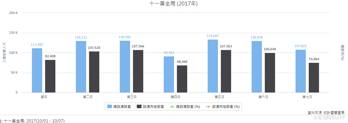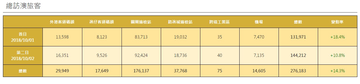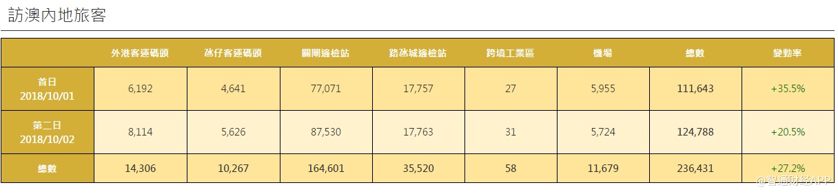 初步统计数据显示,10月1-2日,访澳总旅客人数为27.6万人次,同比增加14.3%。其中,访问澳门的内地旅客为23.6万人次,同比增加27.2%。