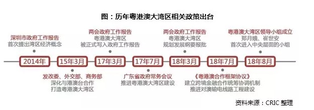 历年来粤港澳大湾区概念在政策上被多次提起。最早于2014年,深圳市政府工作报告首次提出“湾区经济”,把粤港澳城市群勾连起的湾区作为整体规划。2015年3月,在发改委、外交部、商务部联合发布的一带一路相关文件中,首次提出要“深化与港澳台合作,打造粤港澳大湾区“。2017年3月,在全国两会上“粤港澳大湾区”被正式写入政府工作报告。2018年3月,粤港澳大湾区被官方明确为与京津冀协同发展、长江经济带对等的区域发展战略。此外随着近期粤港澳大湾区领导小组的成立,预计未来粤港澳的相关规划细则也将进入落地阶段,而粤港澳大湾区这一主题也必将不断升温。