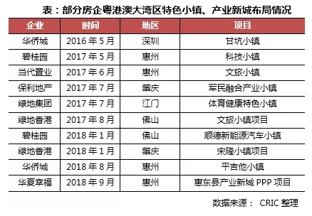 除了旧改和长租公寓,事实上其他多元化业务,如产业小镇、特色小镇、医疗健康、海洋经济等都为房企的布局重点。如产业小镇、特色小镇,近年来就有包括绿地香港、雅居乐、华夏幸福、碧桂园等各大房企参与其中。2017年7月保利地产与肇庆政府签订协议,于高新区建设的全省首个军民融合产业小镇项目;2018年1月碧桂园签约佛山顺德新能源汽车小镇;2018年8月华侨城惠州首个项目——吉他小镇落地。各大房企在布局产业新城的过程中,不仅实现了自身业务转型,也为大湾区引入了高质量的产业集群。