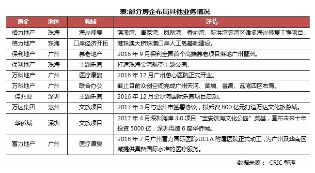 随着粤港澳大湾区的提出,各大房企争相扎推大珠三角地区,除了传统的地产开发外,从长租公寓到城市旧改,从产业小镇到海洋经济,几乎各个领域皆有涉及。事实上,大湾区概念的提出带动了各相关领域的发展,为房企们提供了绝好的多元化业务拓展机遇和空间。