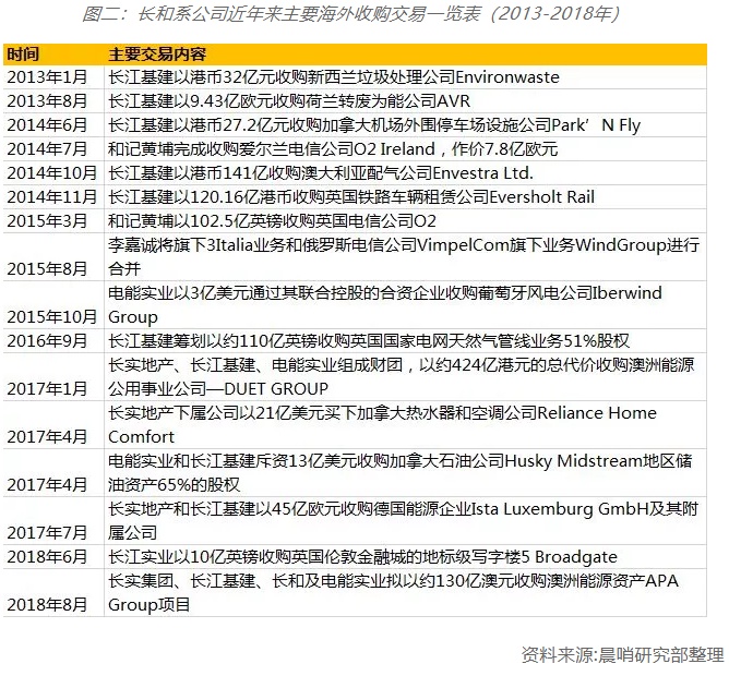 尽管长和系在出售方面近五年内表现十分激进,但与它在全球市场的“血拼”行为相比,就是“小巫见大巫”了。笔者对其五年内有报道和公告的海外并购交易进行了大致的梳理,发现其涉及金额超过4800亿港币(详见图二)。