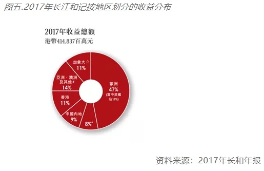 经过过去五年频繁的海外并购之后,长和系越来越像一个重心在外的国际企业集团。以下是2017年长和系旗下两大王牌公司电能实业和长江和记的营收来源地区图(详见图四和图五)。