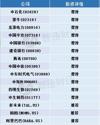 从以下列表中可以看出,小摩中意的港股主要集中在金融、医药、基建等板块,分别是中石化(00386)、蒙牛(02319)、龙源电力(00916)、中国平安(02318)、中国银行(03988) 、建设银行(00939)、中国中铁(00390)、中车时代电气(03898)、药明生物技术(02269)、中生制药(01177)、腾讯(00700)、中国海外(00688)。