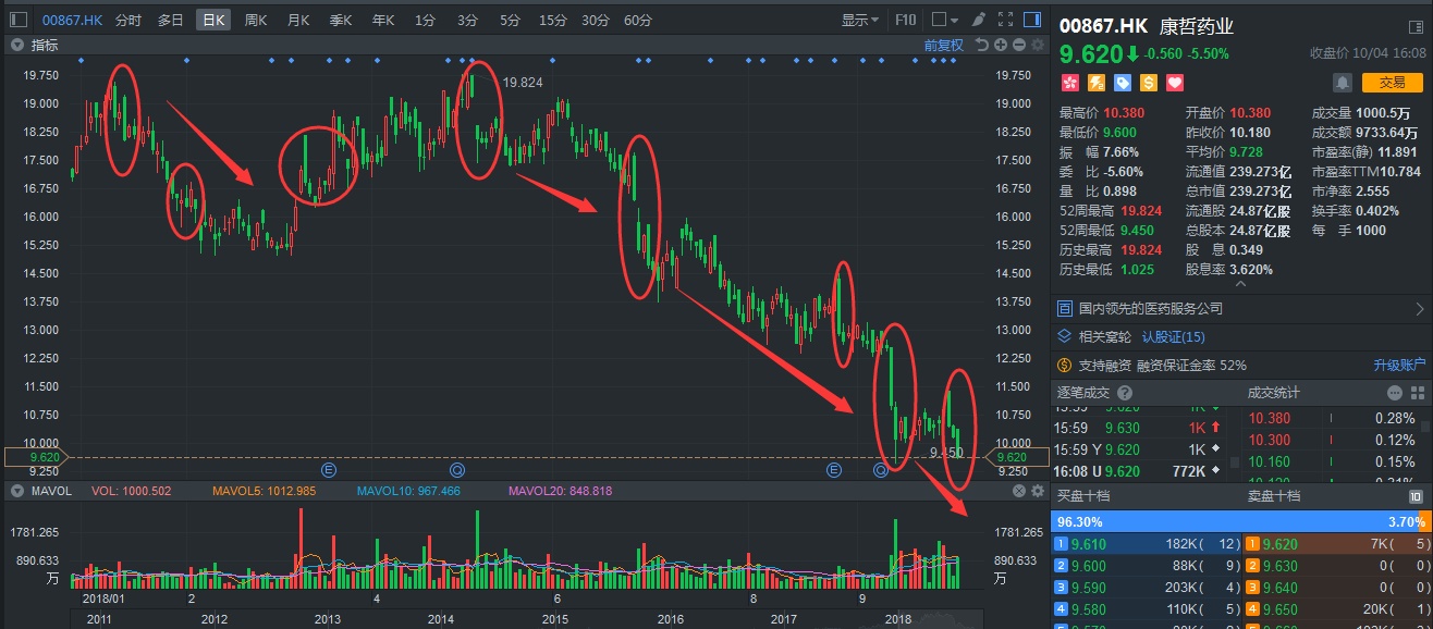大盘惨遭冷眼,医药股再次被推至风口浪尖。以10月4日为例,医药股延续昨日的重挫态势,跌幅到达近3个点。成分股方面,康哲药业(00867)、白云山(00874)、李氏大药厂(00950)等大批二线明星票均处于不利状态。其中,康哲药业更是位于跌幅前列,下挫5.5%。