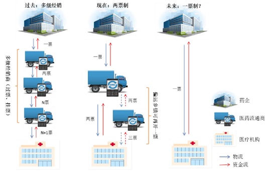 花近10年时间去推进两票制,其目的是怎样的?以前,制药生产企业发货给代理商,代理商再发货给商业公司,商业公司负责将货发往医院,医院则付款给商业公司,商业公司再跟代理商结算,最后才是代理商付款给企业。这种药品供应模式直接造成了货与款分流分离、款与款不同账户,并最终导致了底价、买卖税票,有了票货因票而分出若干销售环节。