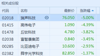 智通财经APP获悉,市场担忧中美贸易关系,手机产业链全线下挫,截止10时43分,瑞声科技(02018)跌5%,高伟电子(01415)跌4.39%,丘钛科技(01478)跌3.82%,舜宇光学(02318)跌1.37%。