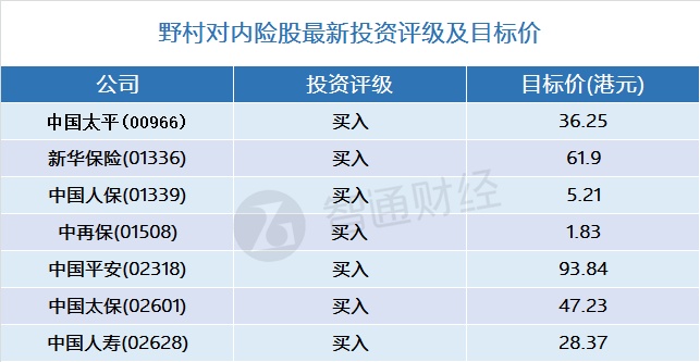 智通财经APP整理,野村对内险股最新投资评价及目标价如下: