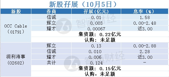 智通财经APP获悉,OCC Cable(01791)、润利海事(02682)等正在招股中。截至10月5日,辉立、耀才、信诚三家券商,为OCC Cable(01791)借出0.01367亿孖展金,认购未足额;为润利海事(02682)借出0.124亿孖展金,近足额。