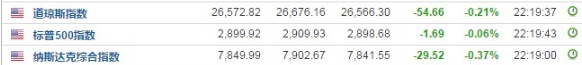 开盘后走势向下,截至发稿,道指跌0.21%,标普500指数跌0.06%,纳斯达克综合指数跌0.37%。