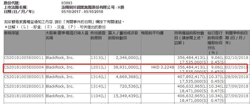 贝莱德增持洛阳钼业(03993)1433万股 大摩减持