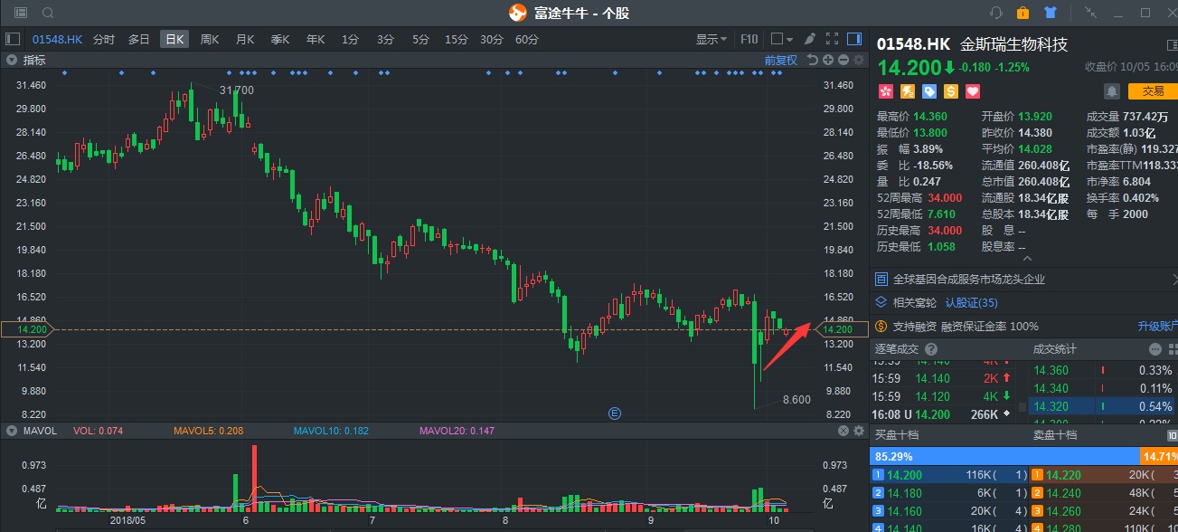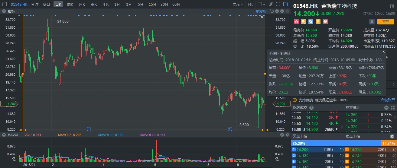 谈及去年的港股牛市,金斯瑞应该算得上是生物医药板块中,非常引人注目的一只股票。就算2018年随大市回调,但表现仍可圈可点:受益港股通北水资金利好,成交量异常活跃,成交量平均每日达到2000万股,总额平均4.08亿港元。细数港股通标的,有如此活跃成交量的股票确实不多。