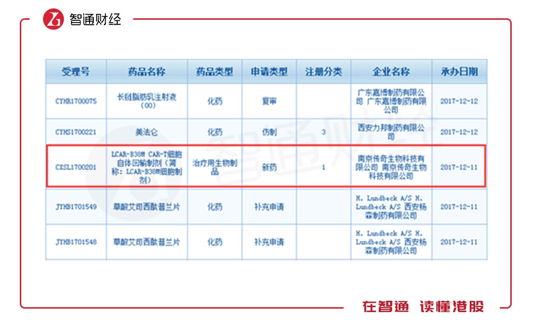 到2017年12月11日,传奇生物提交CAR-T疗法中国临床申请(CXSL1700201)获得CDE正式承办受理,成为国内首个获得受理的CAR-T产品。同月18日,药品评审中心公布第二十五批优先审评审批名单,传奇生物的LCAR-B38MCAR-T细胞自体回输制剂获准进入。2018年3月12日获CFDA临床审批完毕。
