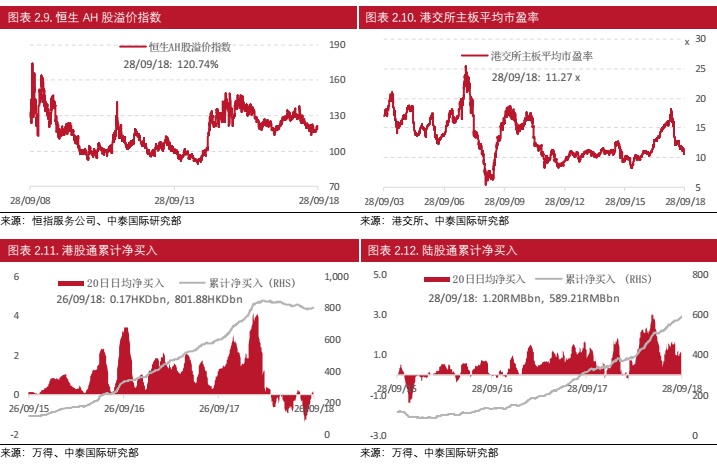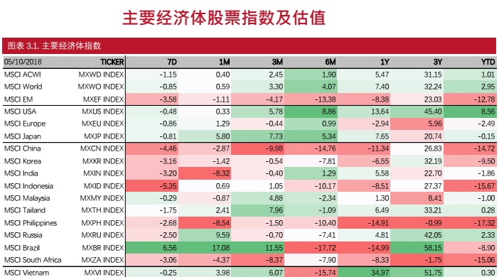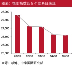 截至 10 月 5 日,MSCI 全球股票指数、发达市场、新兴市场股票指数按周均有回撤。其中,新兴市场指数按周下跌 3.58%,中国指数按周下跌 4.46%。中国在岸市场假期休市,香港恒生指数、国企指数大幅下跌,按周跌幅分别为 4.37% 和 4.50%。我们认为,经济逻辑的重要变化以及市场参与者因素是形成中国主题受挫的主要原因。