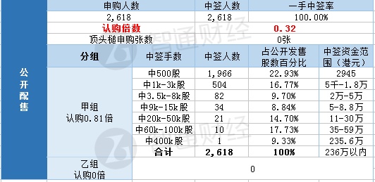 其中,公开配售申购人数2618,一手中签率100%,认购倍数0.32倍。