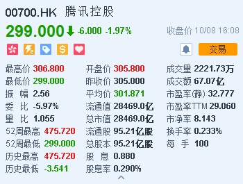 重磅股方面,腾讯控股(00700)跌穿300港元关口,尾盘最低见299港元。截至收盘,腾讯跌1.97%,报299港元。全日成交额达67.07亿港元。其余重磅蓝筹,中国移动(00941)涨0.64%,报78.05港元,恒生银行(00011)涨0.29%,报210.2港元。银河娱乐(00027)跌6.6%,报45.25港元,金沙中国(01928)跌3.87%,报34.8港元,恒安国际(01044)跌2.96%,报68.9港元。