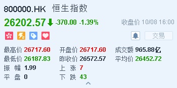 智通财经APP获悉,十一期间恒生指数累计下跌1215.95点,跌幅达4.38%,创近8个月最大周跌幅。A股今日大幅补跌,港股跟随A股走低,一度跌逾300点。港股今早高开145点报26717点,已是今日高位,曾最低见26187.83点,再创9月12日以来低位。截至收盘,恒生指数跌370点或1.39%,报26202.57点,全日成交额达965.88亿。国企指数跌1.3%,报10393.29点,红筹指数跌2.06%,报4197.47点。