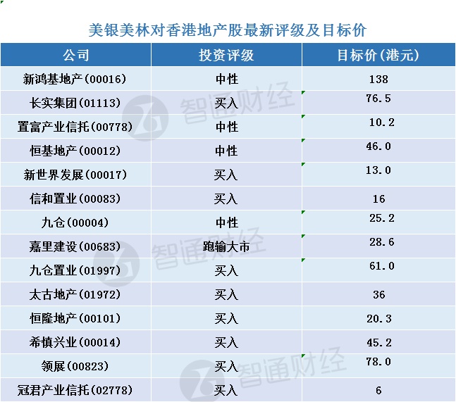 一、美银美林对香港地产股最新投资评级及目标价