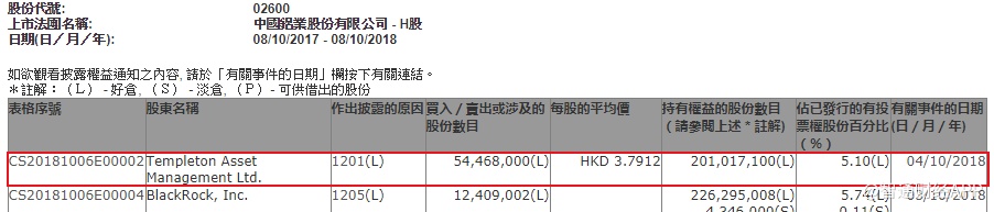智通财经APP获悉,根据香港联交所资料显示,Templeton Asset Management Ltd于10月4日减持中国铝业(02600)5447万股,每股作价3.79港元,套现约2.06亿港元,最新持股量降至5.1%。