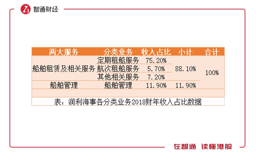 船舶租赁及相关服务是润利海事的主要服务,以2018财年(截至3月31日止年度)业绩计,该业务占公司总收入的88.1%,船舶管理业务占11.9%。而船舶租赁及相关服务又包括三个业务类别,分别是定期租船、航次租船、以及囊括提供船员、海事咨询、船只维修及保养服务在内的其他相关服务,三个业务在2018财年的收入中占比分别为75.2%、5.7%、7.2%。