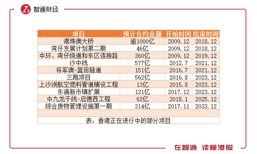 香港政务司司长张建宗在近期的表态则直接提振基建板块,其表示,除了三跑道系统之外,还有房屋发展、中九龙干线及庞大的医院发展计划等重大项目。预计未来五年,香港每年的整体建造工程量会维持在2500亿元至3000亿元的高水平,未来十年,政府在基建的总投资将超过一万亿元。