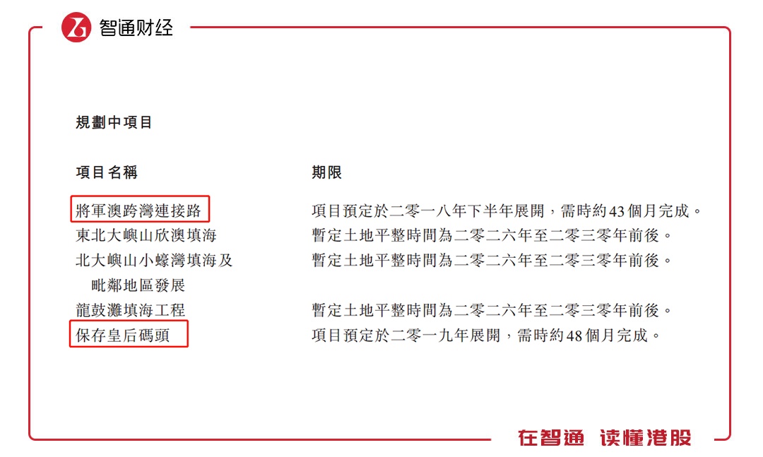 除此之外,香港政府规划中的项目将陆续展开,其中,将军澳跨湾连接路、保存皇后码头将分别于2018年下半年、2019年开始施工,带来新的需求增量。